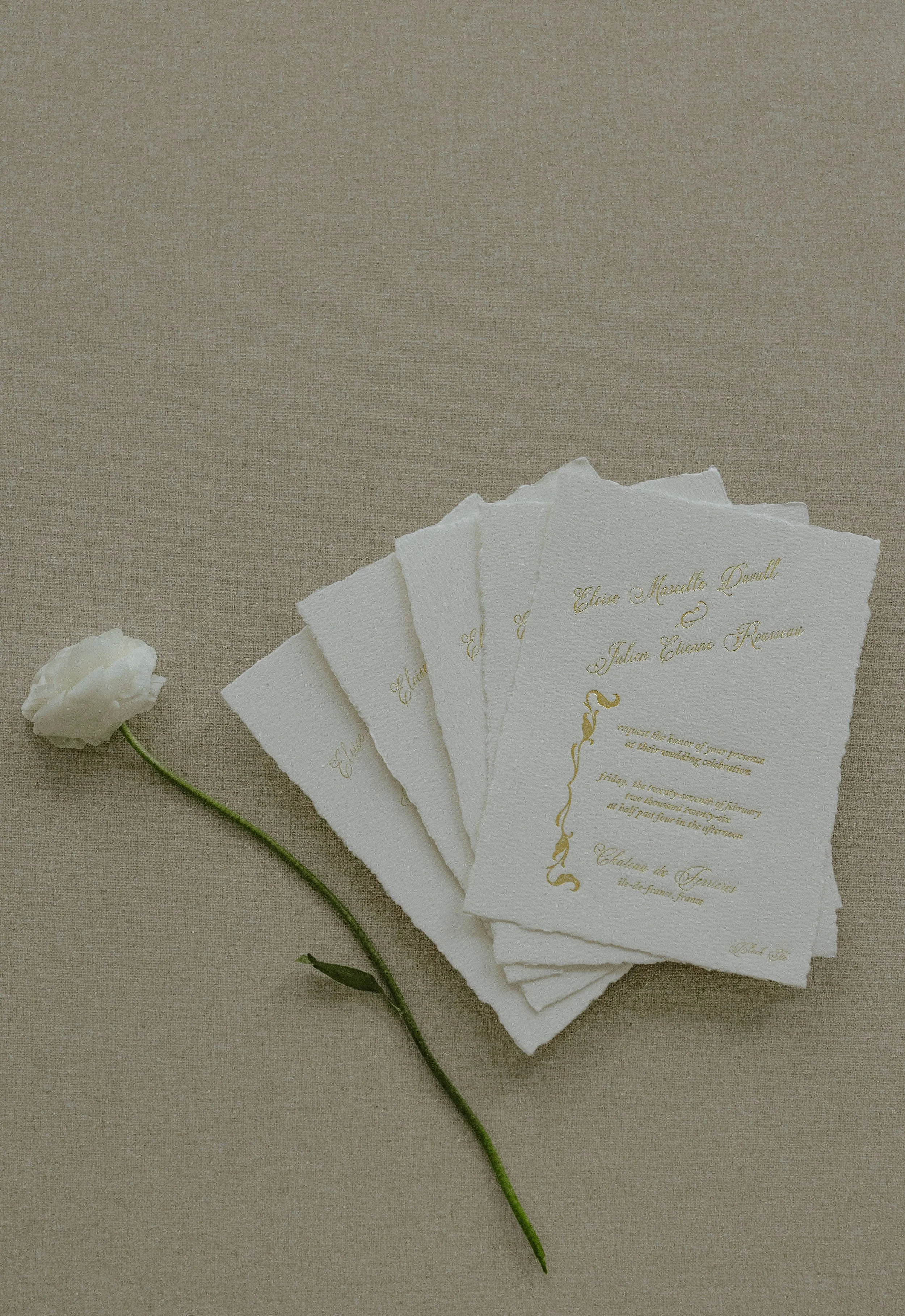 From botanical-inspired illustrations to the delicate shimmer of foil-pressed designs, our bespoke stationery and paper goods bring your story to life with artistry and intention. We specialize in fine wedding suites, personalized invitations, and custom paper creations, each crafted with luxurious textures, hand-finished details, and thoughtful touches that make every piece unforgettable.