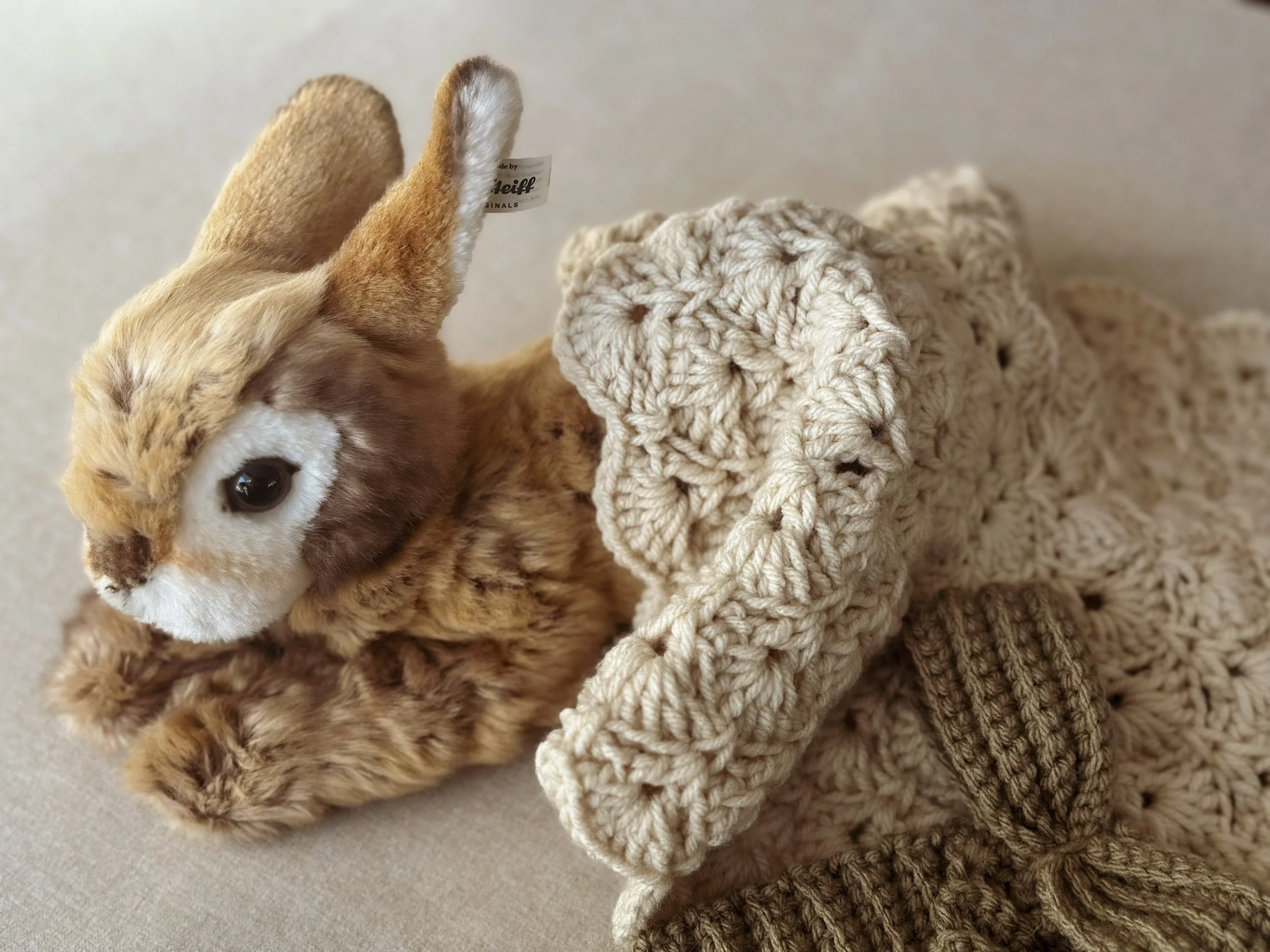 Scaled intentionally at approximately 14” × 14”, this organic crochet doll blanket is ideal for heirloom dolls, doll strollers, doll beds, keepsake baskets, and storybook play displays. It is created as a keepsake accessory rather than a mass-produced toy textile — meant to be treasured, gifted, and saved.